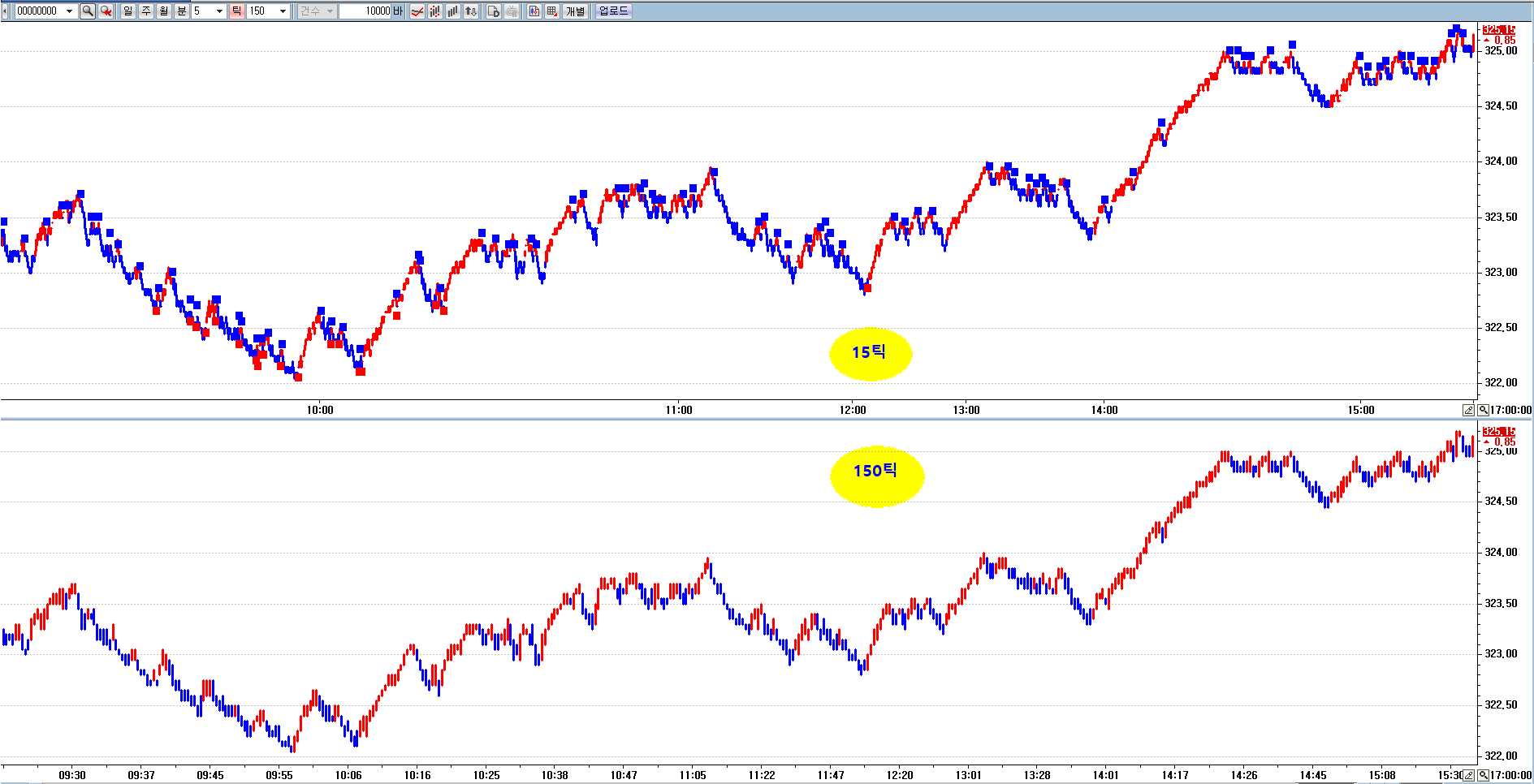 15틱 차트에서 아래 그림처럼 150틱 bar를 보고 싶습니다.