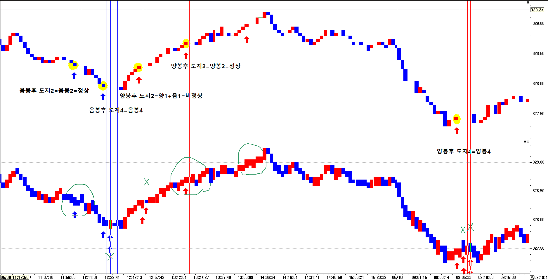 단지 매봉이 음봉과 양봉 도지로 구분해서 차트의 색상을 구분하신 다면