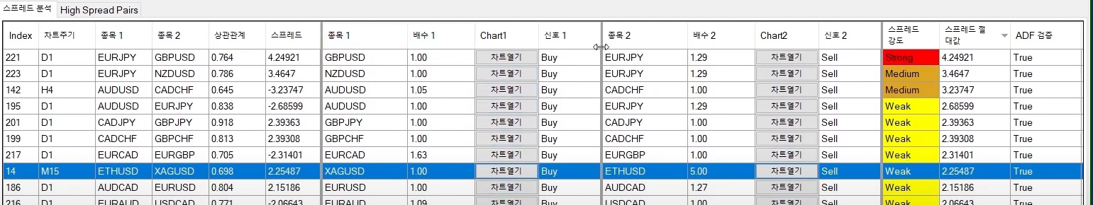 검색까지는 아니더라도 두종목간의 스프레드 절대값과 상관관계지표를 구현하고싶습니다