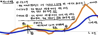 그 b 를 현재 macd지표(빨간선)가 돌파할때(c) 매수