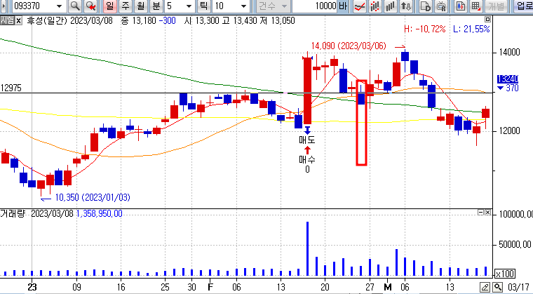 그리고 빨간 박스에서 중심선을 이탈했으니 매도하고싶습니다.