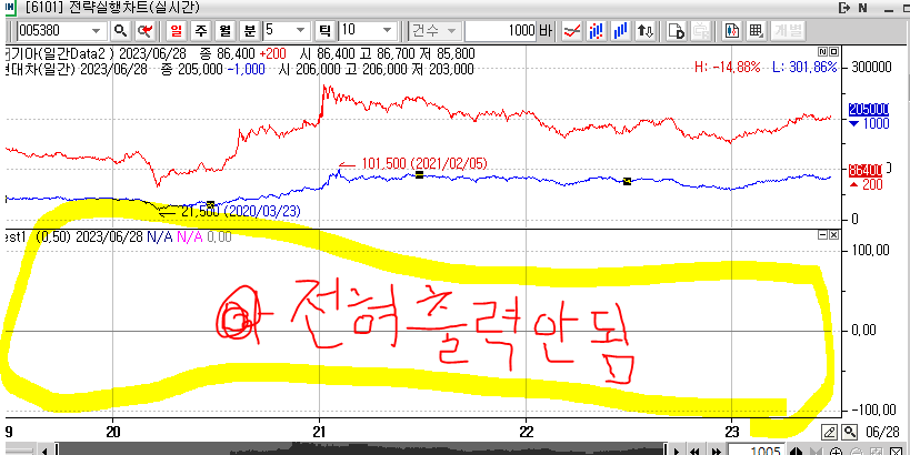 그런데 일봉갯수를 줄여서 1000개로 했을때는 지표출력이 전혀 되지 않네요
