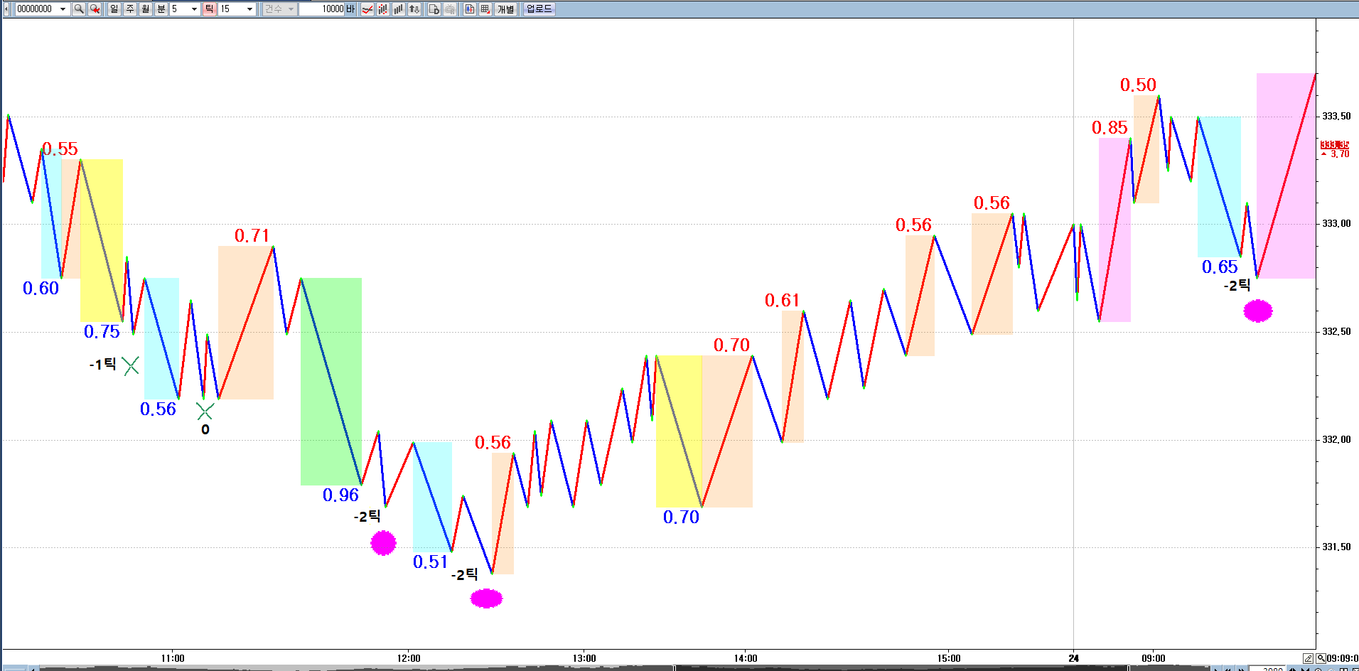 하락추세선의 크기가 0.5p 이상일 때, 다음 하락추세선의 저점이 -2틱으로 쌍바닥이 될 때 동그라미 표시. 0.5p 이하이면 기존 수식대로 +2틱에서 -1틱에 쌍바닥이면 표시.