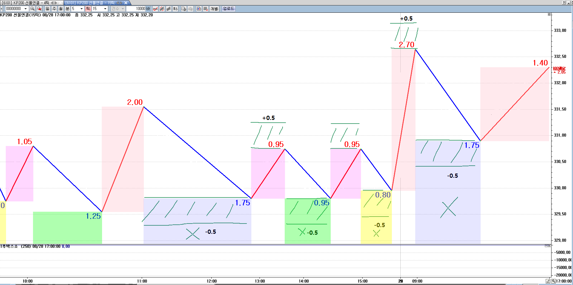 하락 박스 상단은 그림같이 추세선 하단에 맞추고(LL), 박스 하단을 하락추세선 하단 -0.5p 아래에서 끊을 수 있을까요? 빗금친 부분만 박스. 크기별 색상 그대로 유지.