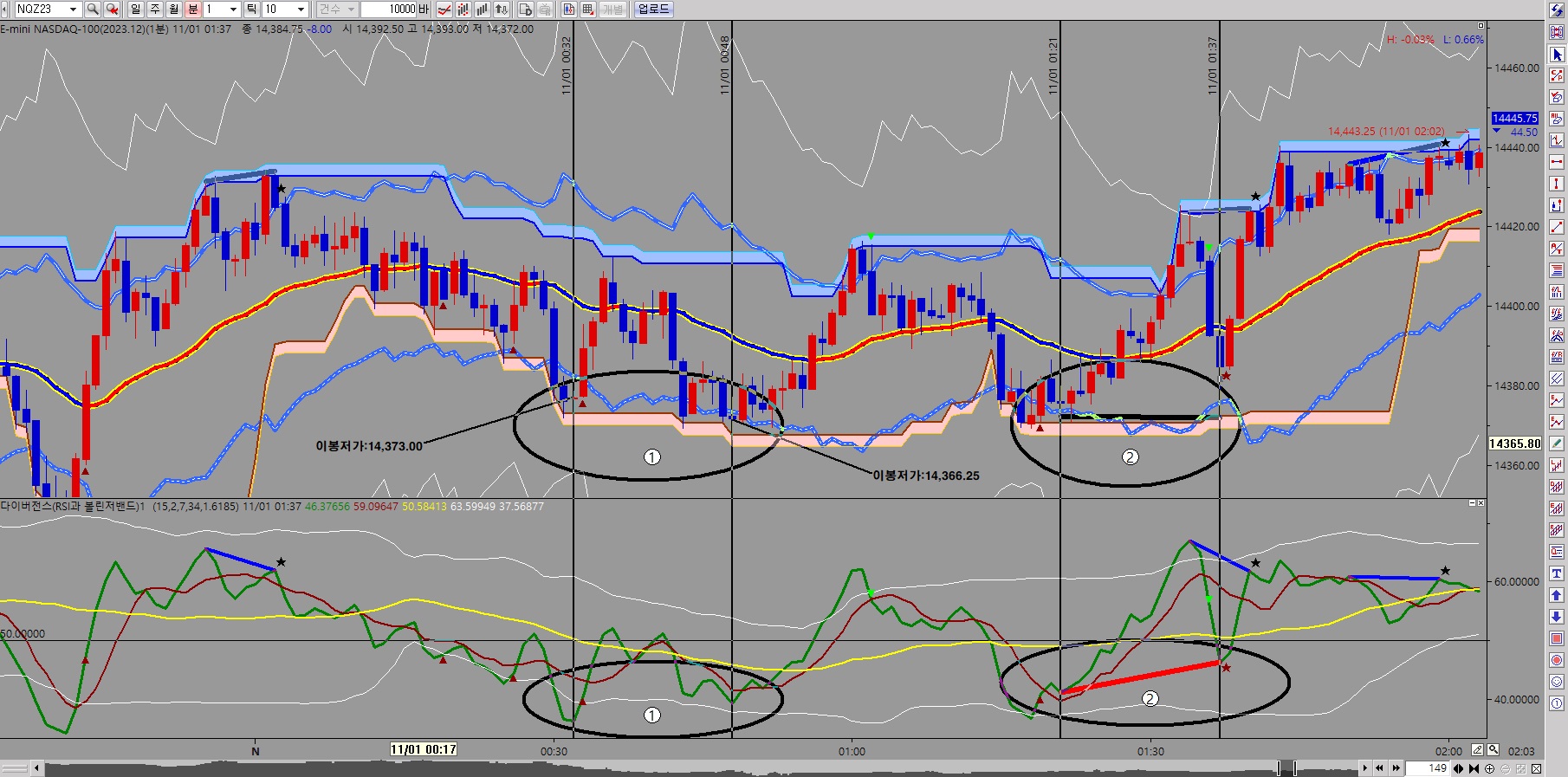 아래수식은 RSI 다이버전스 수식같으데요 분봉에적응해보면 그림처럼 2번타원형에 선이 나타나는데