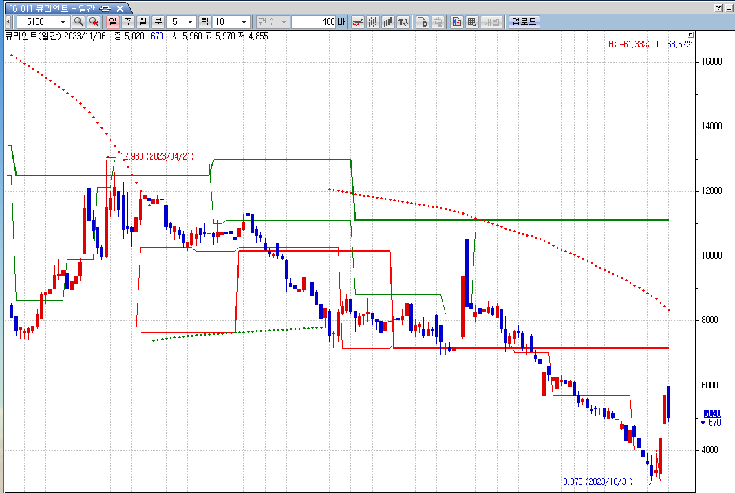 최저가의 변동폭이 20%이상 나오고 해당일 봉은 최고가 대비 종가가 -15% 이상