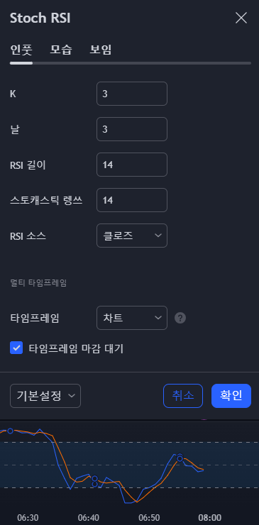 indicator(title="Stochastic RSI", shorttitle="Stoch RSI", format=format.price, precision=2, timeframe="", timeframe_gaps=true)