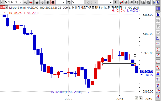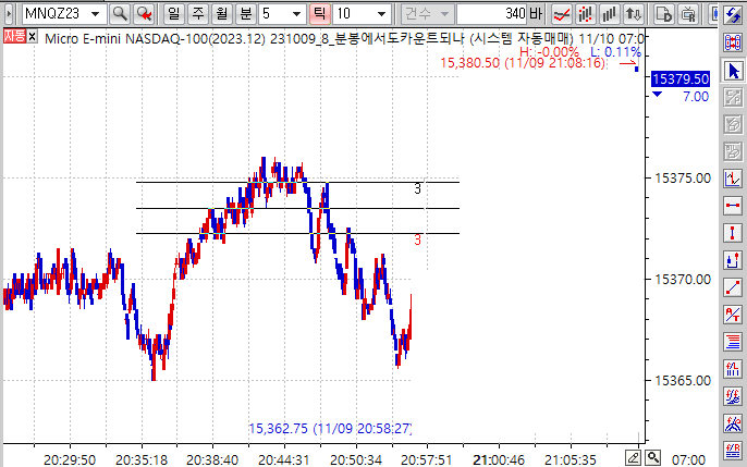 10틱에서는 상단선과 하단선을 왔다갔다 터치하는 횟수가 잘 세어지는데요.