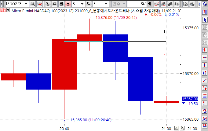 10틱에서 1분봉, 5분봉으로 갈 수록 상단과 하단의 터치 횟수가 줄어들게 됩니다.