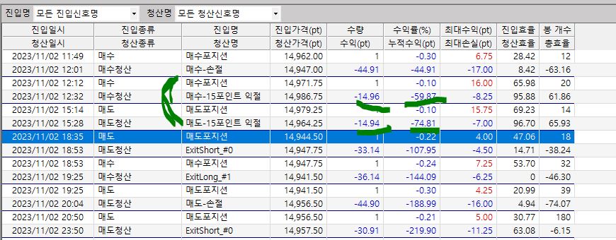 1. (문의사항) 그림 1번에서 보시면 익절 청산을 했는데도 성능보고서에는 마이너스로 나오는데 왜 그러는걸까요??