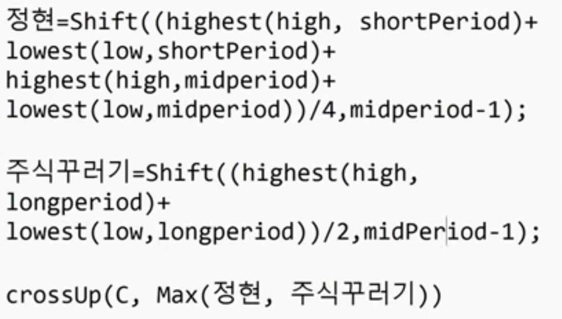 정현 = (highest (high, shortPeriod)+lowest (low,shortPeriod)+highest (high,midperiod)+lowest (low,midperiod))/4;