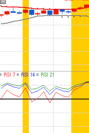 RSI(7)/RSI(14)/RSI(21) 선이 역배일 때도 강세 색상 나옵니다(첨부파일1 확인 부탁드립니다)