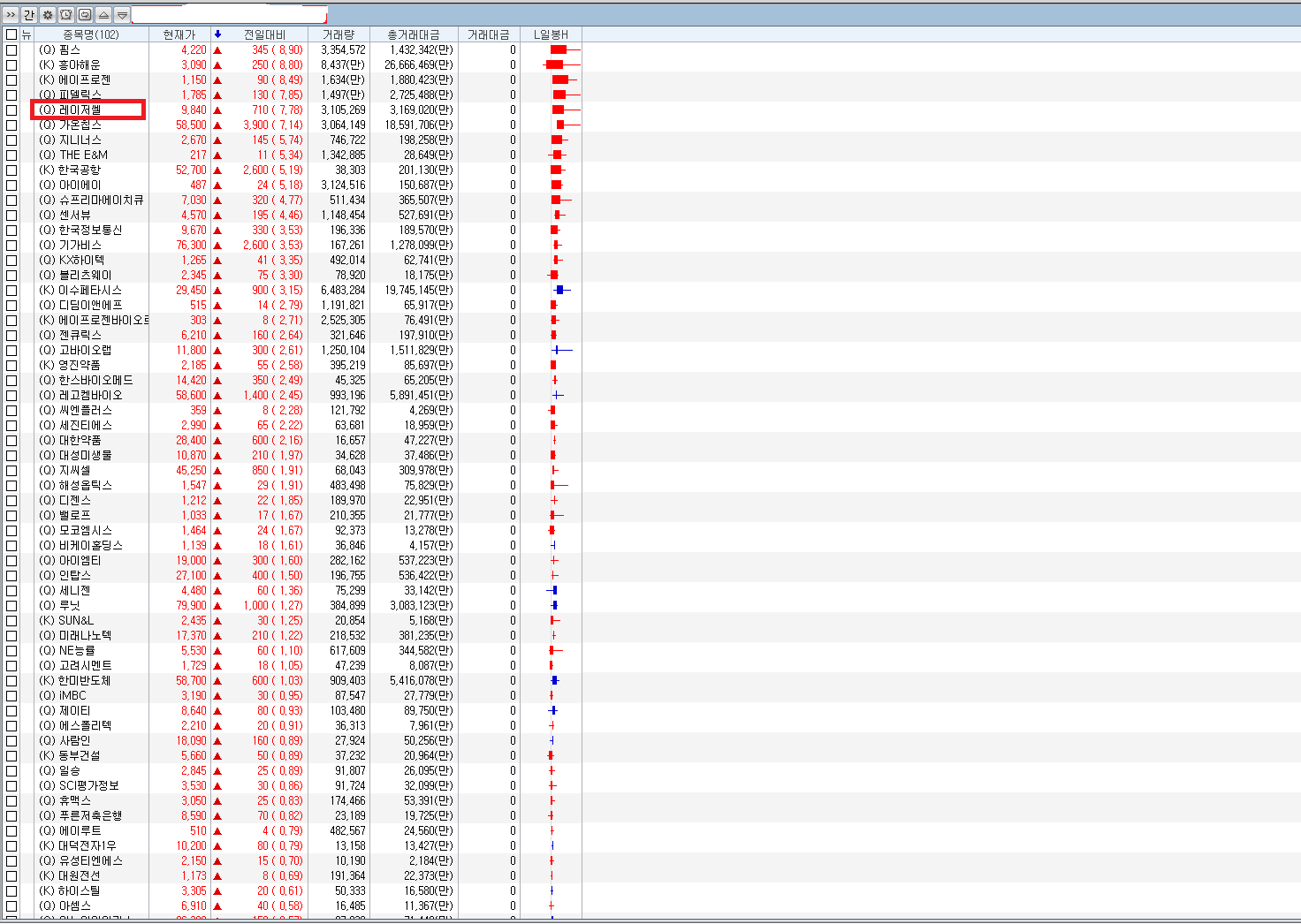 N봉이내에 1회이상 전봉대비 1000%이상 거래량이 발생한 종목을 찾게 됩니다.