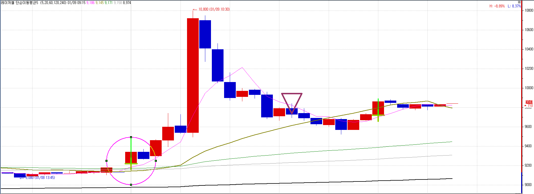 k = (highest(high,중기)+lowest(low,중기))/2;