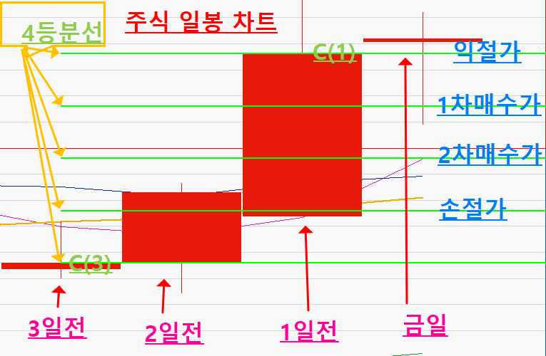 3. C(1) - (C(1) - C(3))*3/4 대비 5틱 이상 하락 시 보유수량 전부 시장가 매도 손절 청산 후 추가 진입금지