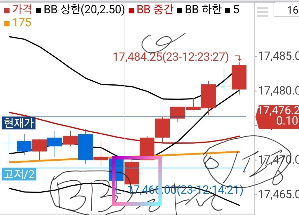 조건 이평 60선과 볼밴하단선이 -+ 10틱이내일때.