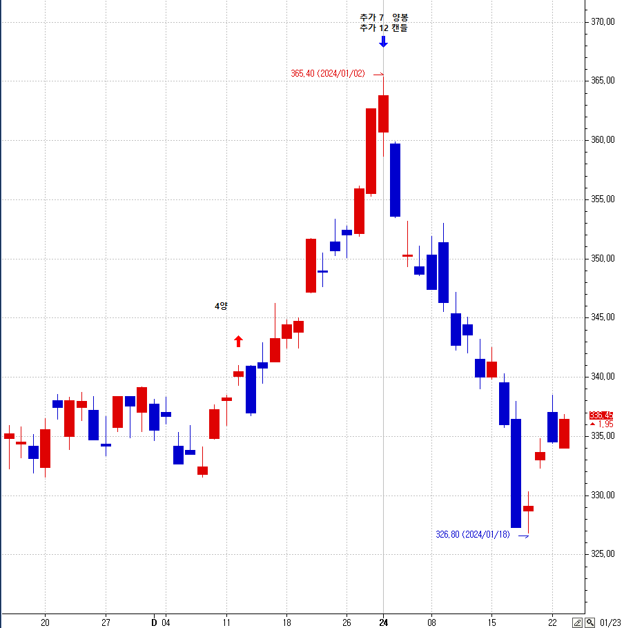 1) 6개 캔들 조합이 음+양양양양+음 일 때 이후 추가 7양봉 고가를 표시한다