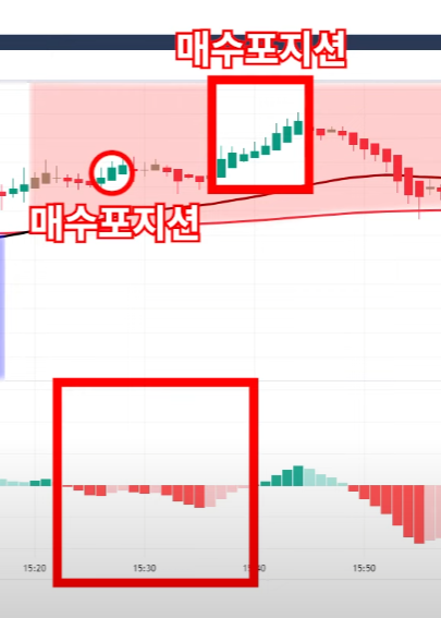 MACD 빨간막대 한번이라도 생성후 밑꼬리 없는 상승캔들 발생시