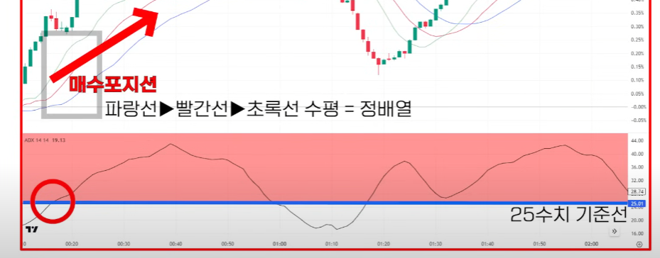 adx수치가 25이상일때 엘리게이터선이 정배열이루어지면매수 진입(1번그림참고)