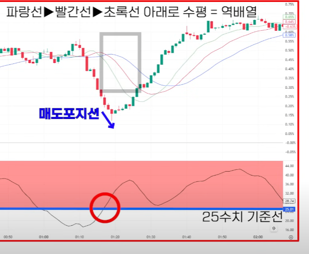 adx수치가 25이상일때 엘리게이터선이 역배열이루어지면매수 진입(2번그림참고)