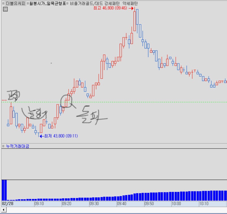 1. 날짜가 바뀌고 당일 고점을 현재가가 상향 돌파하는 종목(그림처럼 최소 N봉(초기값:5) 동안 캔들이 고가 아래 유지 후 돌파)