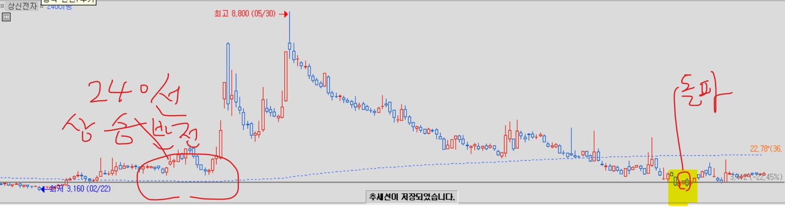 2. 상승반전할 때 240일 이평값을 기준선으로 정하고 기준선을 양봉 돌파하는 종목