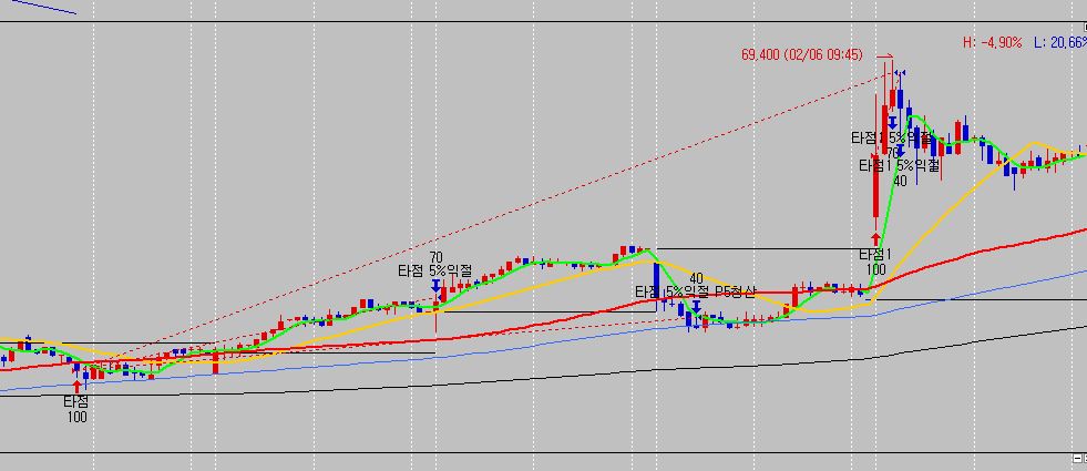 타점 에서 100주 매수후 30주 매도 하고 중간에 30주 매도 해서 총 40주가 남은