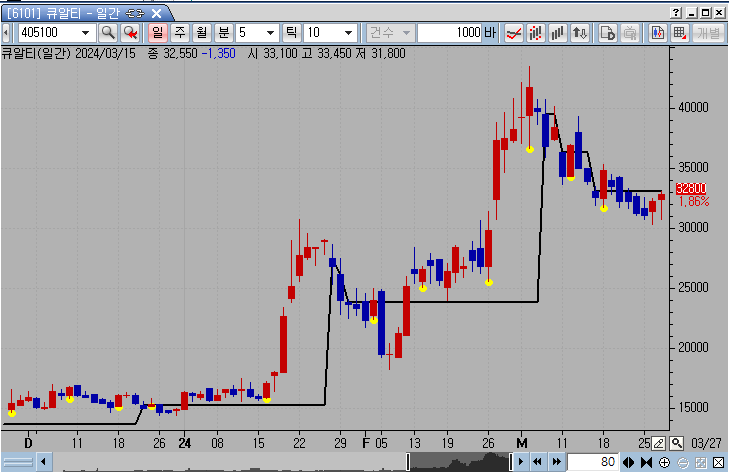 예를들면 큐알티(405100)라는 종목에서 3월 12일과 18일의 점은