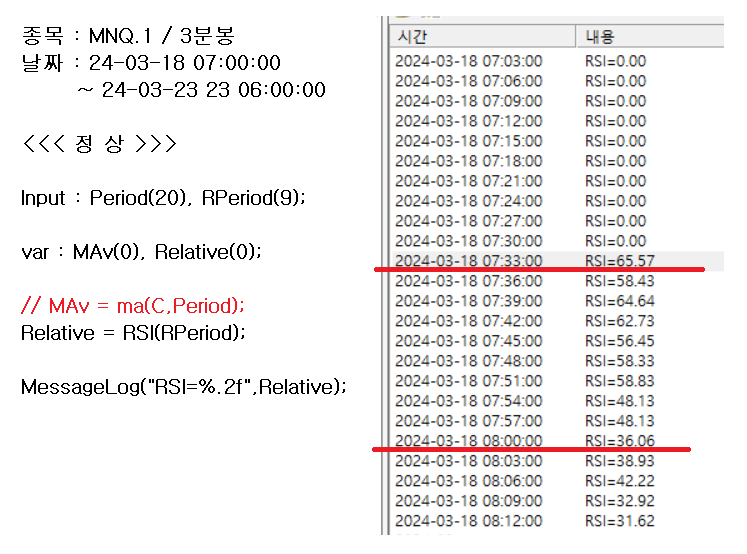 검색 시 이평의 유,무에 따라 RSI 값의 변화가 생겨 문의합니다