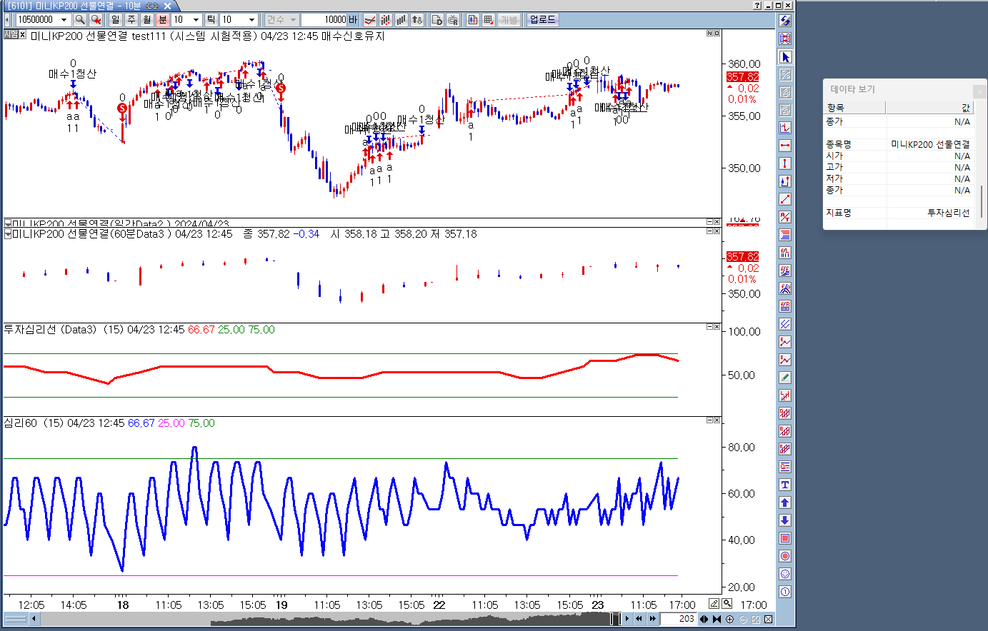 60분봉 차트에서 봉이 그려지는 구간은 투자심리선 (Data3) 값이 나오지만 그 사이 빈 구간에서는 값이 null 이라 그런지 Data3 차트에서 가져온 Simrido(period) 값을 10분봉 시스템에서 제대로 적용을 하지 못하는거 같습니다. 예시로 매수할 때 MessageLog() 각 10분봉 마다 60분봉의 투자심리선의 값을 구해보려 했지만 예스트레이더가 바로 종료됩니다.