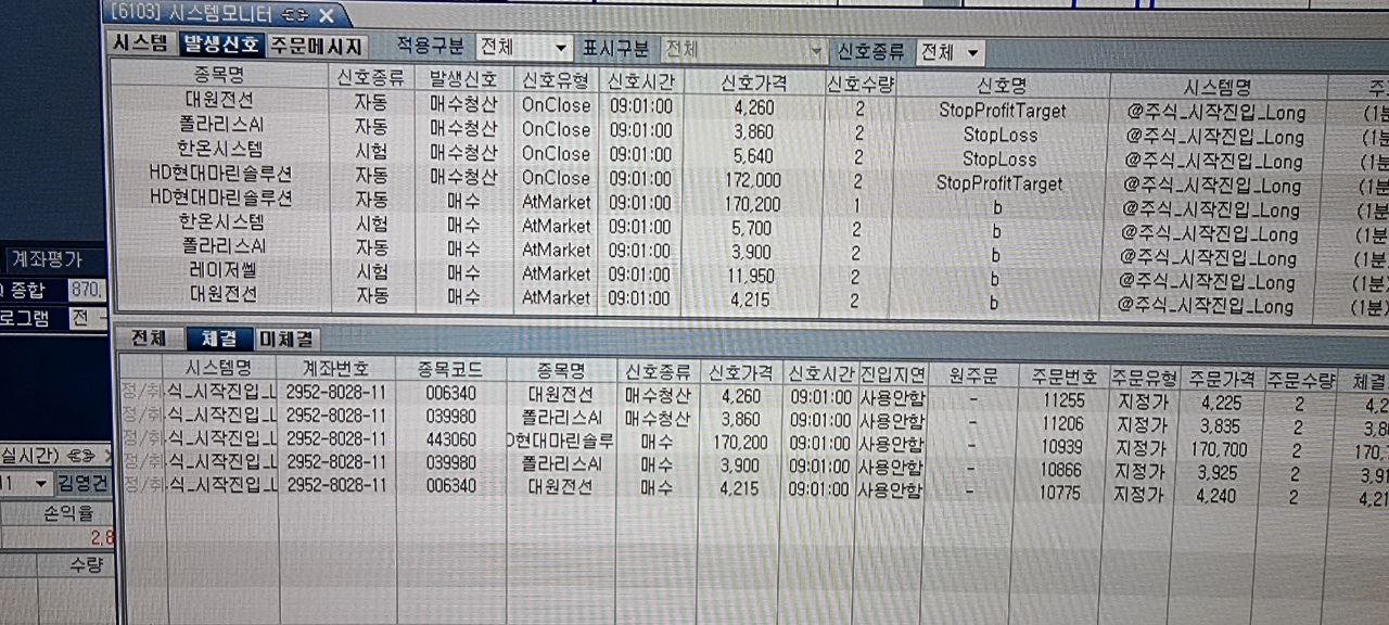 국내주식으로 9시가 시초가인데 모두 1분으로 신호가 발생합니다