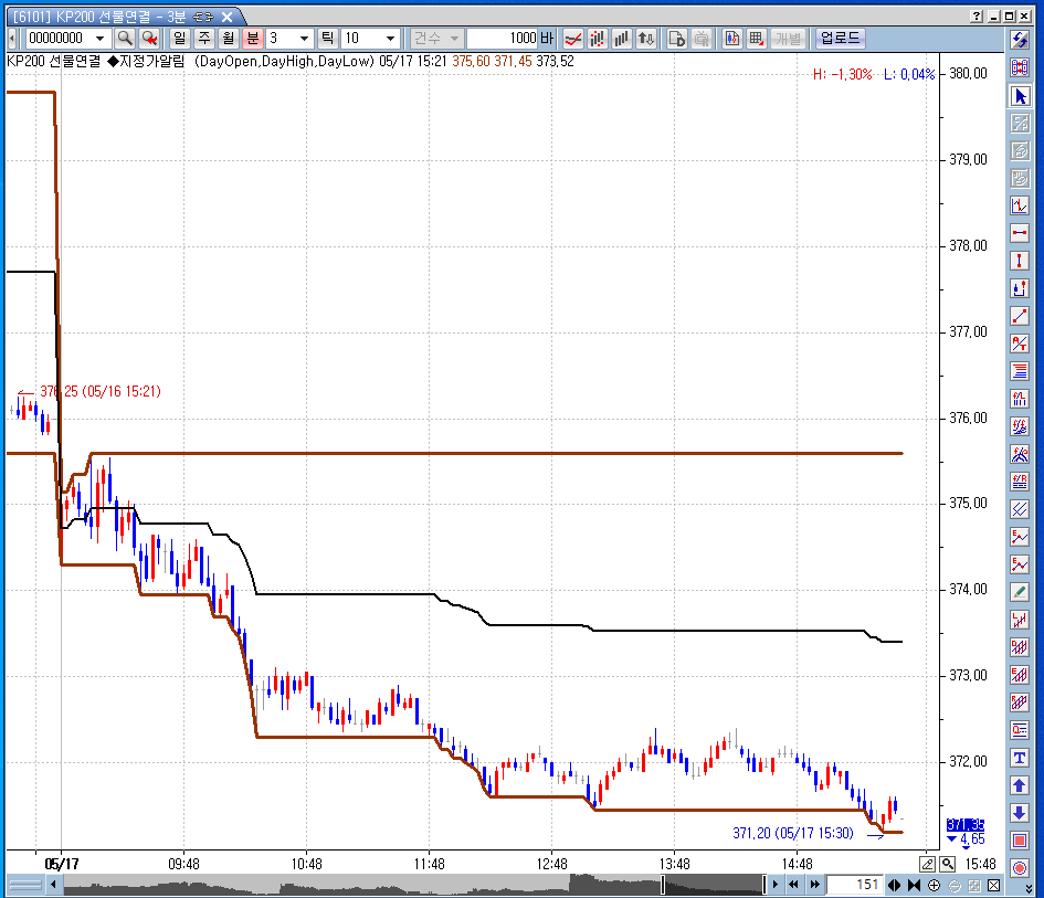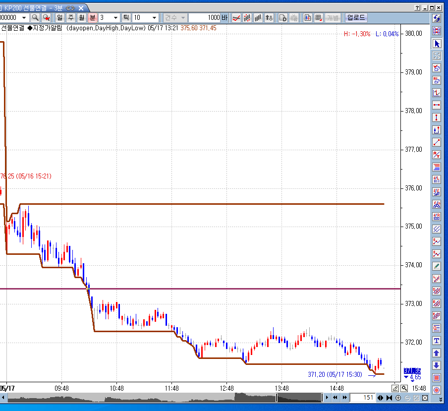 분봉차트에서 당일의 고가 저가 라인을 그리고 중간값을 작성하면 그림1 파일처럼 중간값(검정색라인)이 계단식으로 나타나게 됩니다.