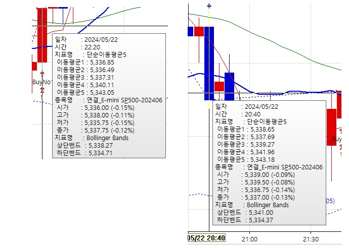 매도예시의 경우 5338.65와 5337.69가 봉 몸통안에 있고 가장 낮은 이평선인 5337.69를 올림하여 5337.75에 매도주문되게