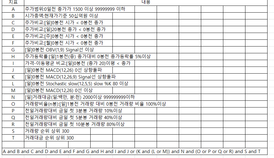 저희 프로그램에서는 각각 작성해 종목검색화면에서 조합해 검색하셔야 합니다.