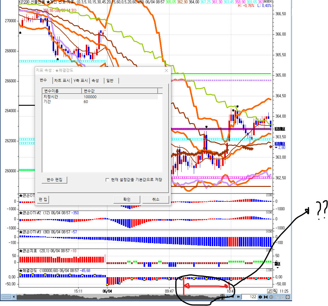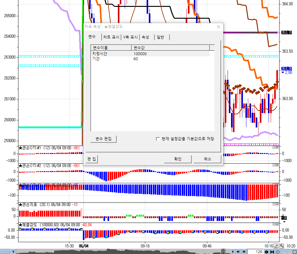 장시작후 처음에는 당일의 체결강도 누적이 영향을 미치게 만들고, 지정시간 이후에는 특정기간 (예를들어 체결강도 60 이평) 이 영향을 미치게 만들고 싶었슴니다.