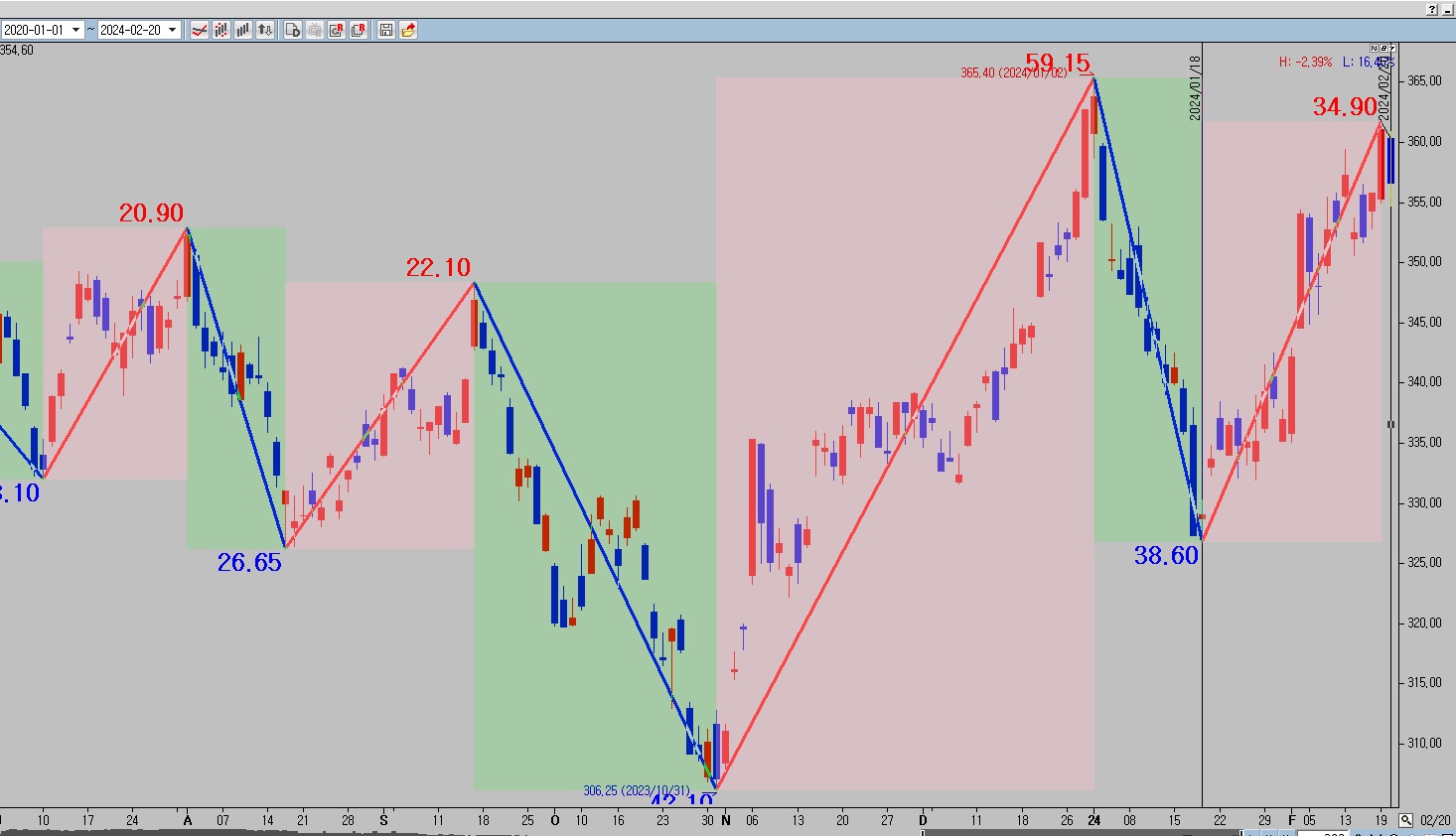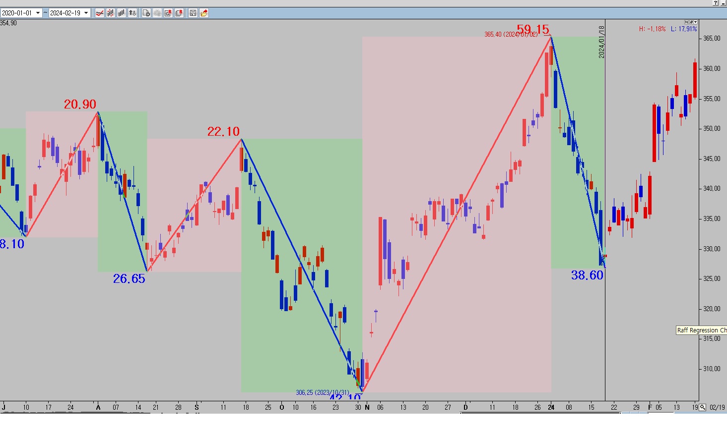여기에서 RED 박스의 시작점이 하락추세가 끝나는 2014.1.18일 부터가 아니라 상승추세선이 형성된 것을 알기 시작한 2024.2.19 일부터 시작되게 그려주고 싶습니다.