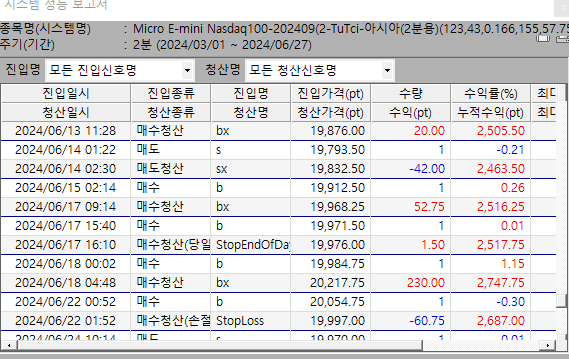 > 해외선물 시간설정을 다음과 같이 적용하여 시뮬레이션을 돌려 봤더니 시간설정 범위외에서도 진입청산이 이루어진 것을 발견했습니다.