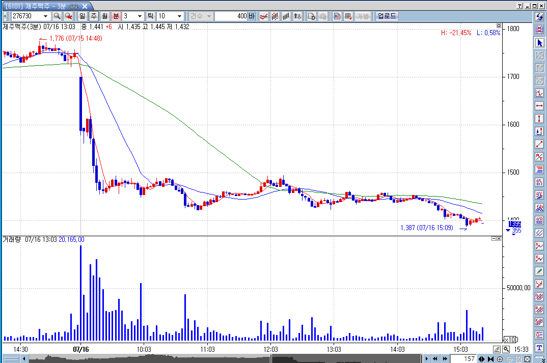모든봉을 확인해도 거래량이 터져서 체결강도가 300% 이상 나와야할 봉이 보이지않습니다.(3분봉에서 어느 특정 시간 3분에 거래량이 없어서 누락이 되었다면 이해가 가지만 제주맥주는 거래가 오전부터 꾸준한 종목이었습니다.)