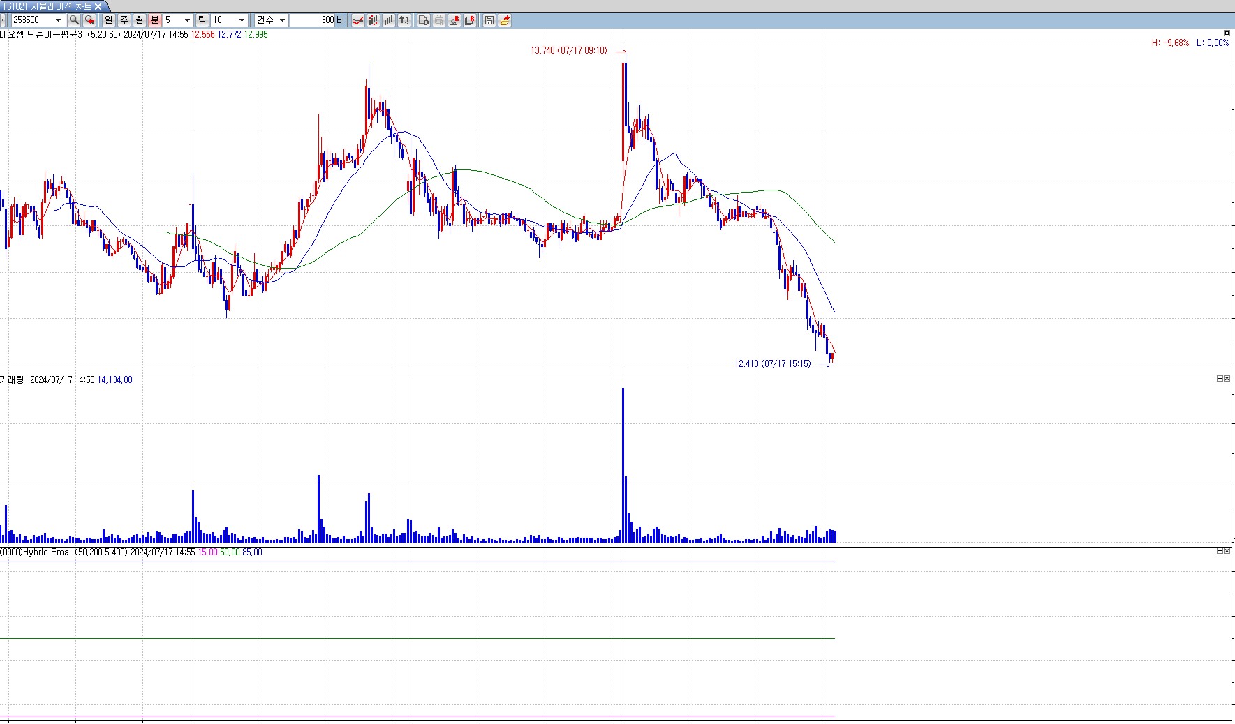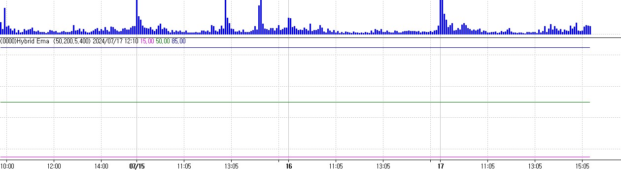 Hybrid EMA 관련해서 87292로 답변을 주셨고,해당 지표 생성시에는 문제 없다고 나오는데 시물레이션 차트를 띄우고 지표를 추가 적용을 해보니 첨부와 같이 세줄만 뜨는데 설정이 잘못되었는 확인 부탁드립니다.