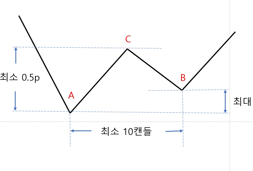 1. 저점(A)와 저점(B) 사이에는 최소 10개의 캔들이 발생함
