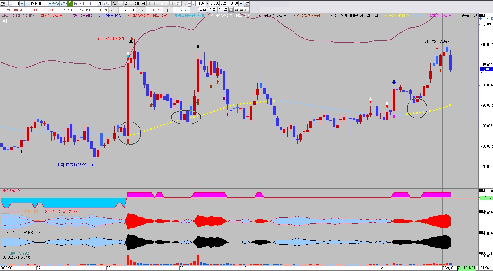 해당 수식을 우상향이며, 근접 3% 이내에 종목이 검색이 될 수있게 부탁드립니다.