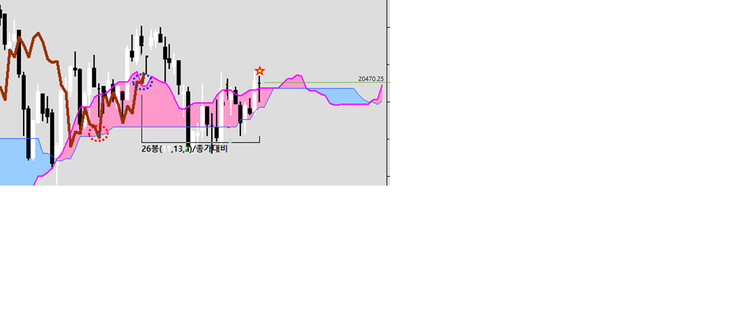 조건:후행스팬이 선행스팬1을 상향돌파 시 현재 캔들에 별모향 표시