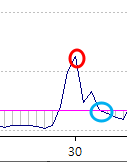 1.첨부파일에서 a지표가 기준선을 cross down 하기 직전 a지표의 가장 높은 고점을 표현 할 수 있는가요?