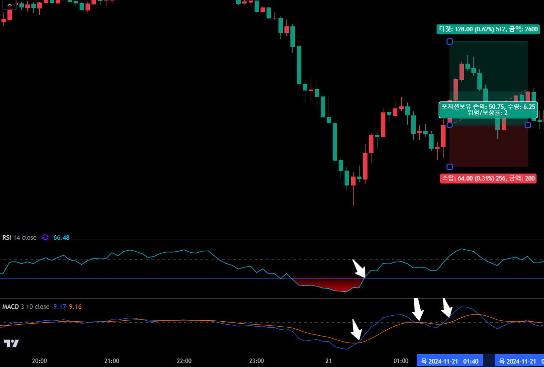 // 마이크로 나스닥 5분봉에서 RSI가 과매도권(25)에 들어왔을 때 MACD 단기(3)가 장기(10) 하향돌파
