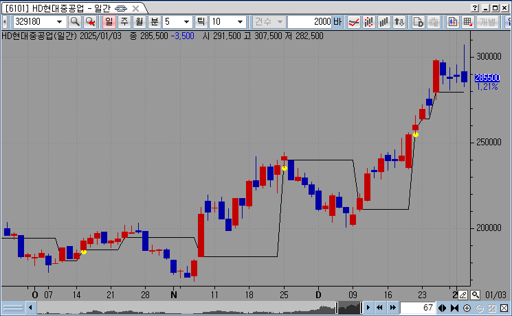 첨부한 그림에서 보듯이 선이 올라가서 노랑점이 생긴 날짜는 9/20일 10/15일 11/25일 12/20일인데, 그 중에서 11/25일과 12/20일은 전전선의 높이보다 가격이 높습니다