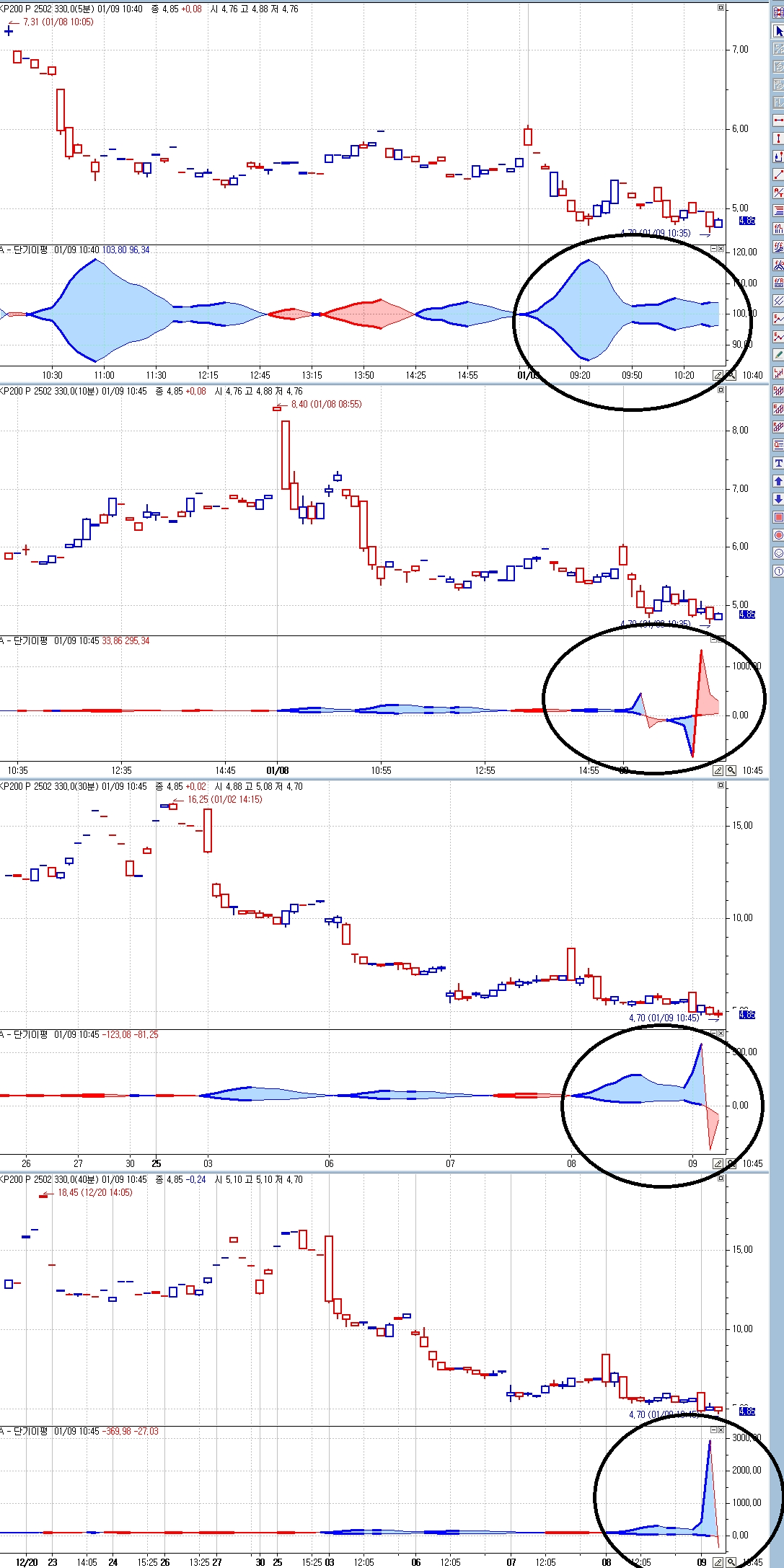 예를 들어 첨부한 그림파일의 동그라미에서 처럼 풋 옵션의 2월 330 의 5분 옵션은 정상으로 나옵니다.