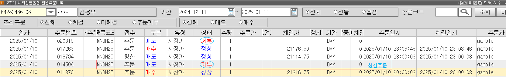 또 다른 계좌에서는 정상적으로 진입 청산이 이루어짐