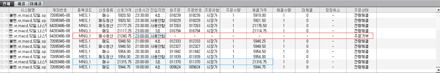 다음 진입에서도 주문거부가 두번 나옵니다.(증거금 부족이 아니었습니다.)황당한 상황이 벌어졌네요..