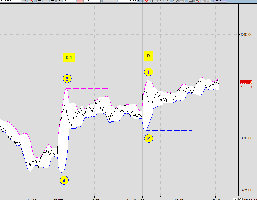4,첫시작 볼밴 하단밴드 최저점을 익일 Y축까지 그리기