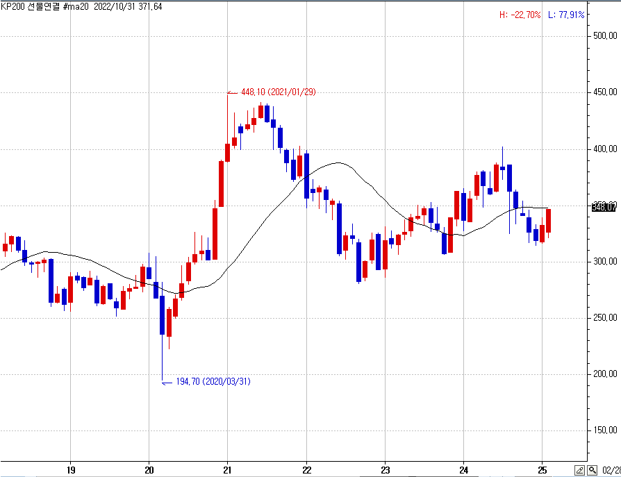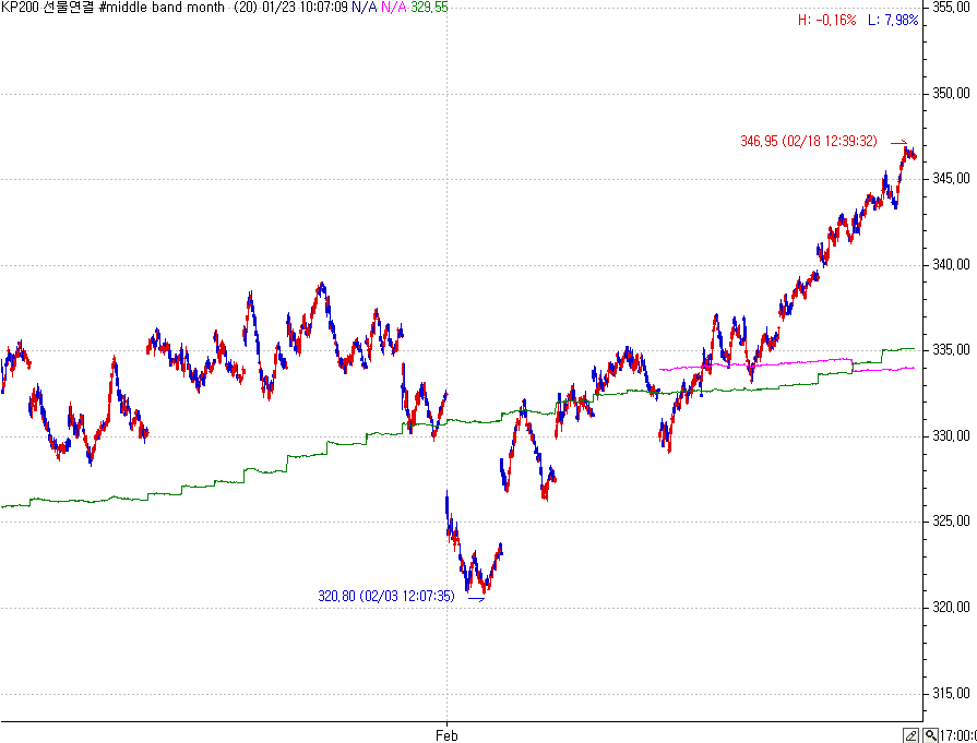 > 월간 차트 ma20 값이 348.07 인데 틱 차트 타주기 차트에 표출되지 않습니다